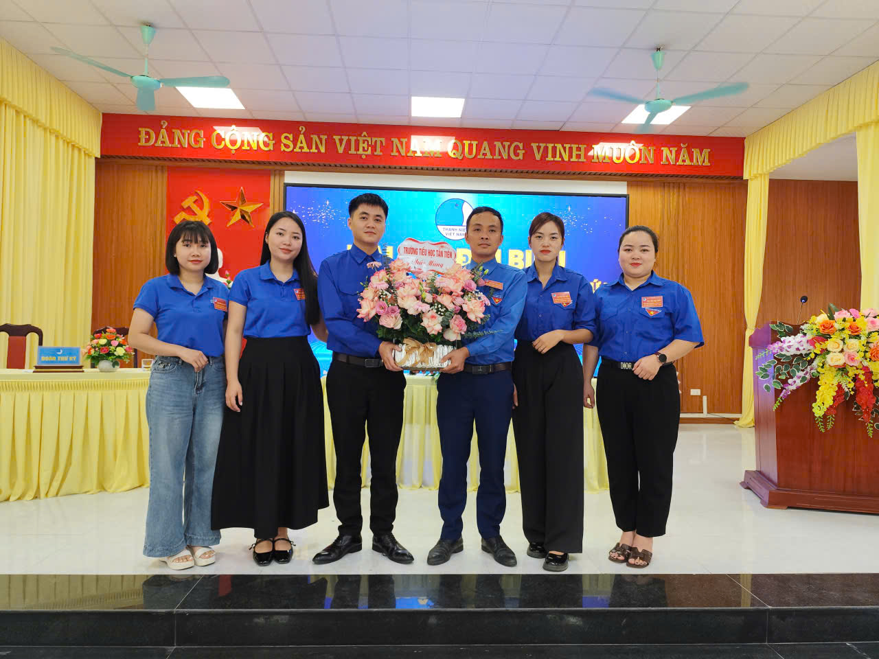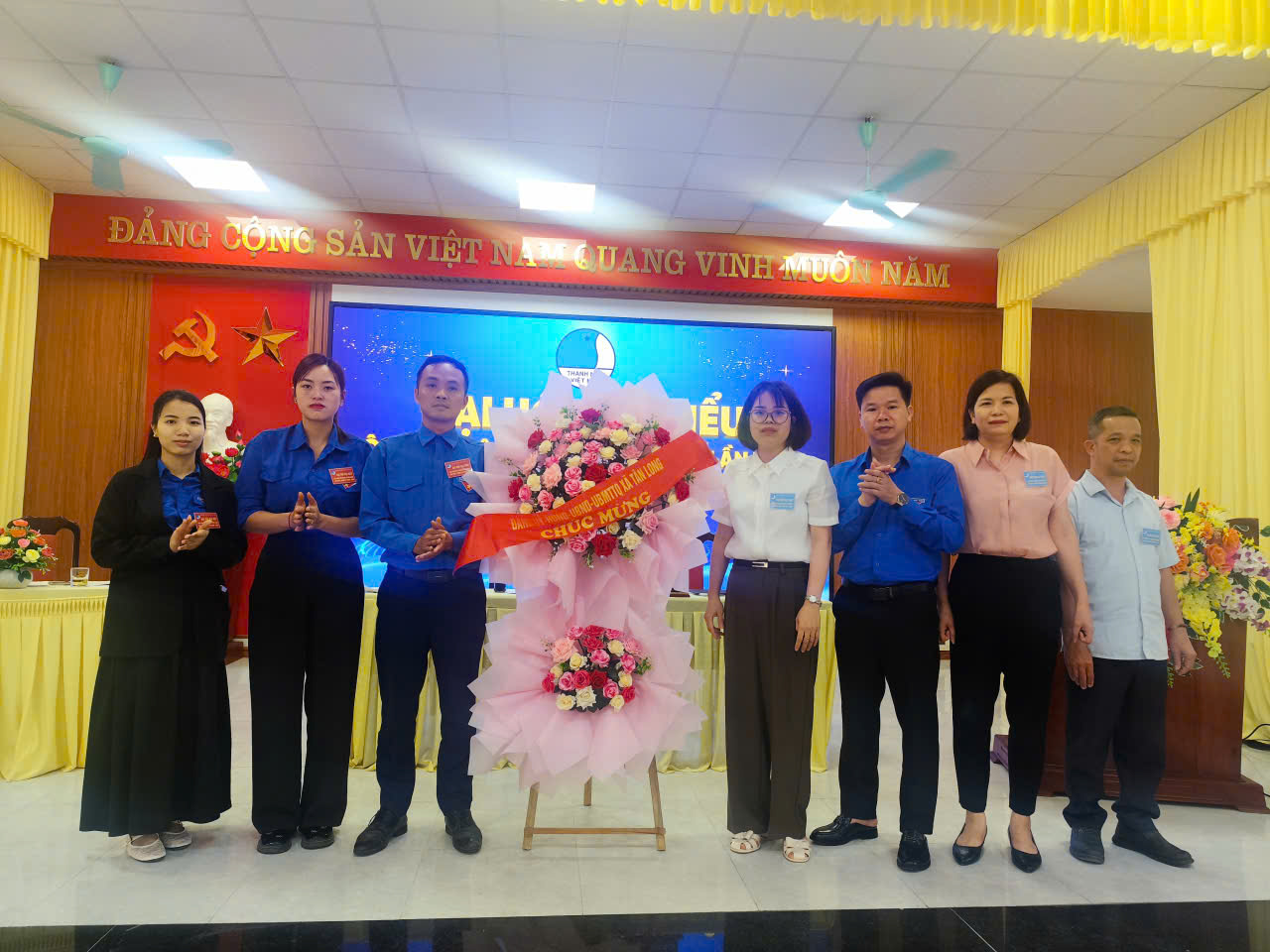 Trường tiểu học Tân Tiến tặng hoa chức mừng đại hội Hội Liên hiệp Thanh niên Việt Nam xã Tân Long