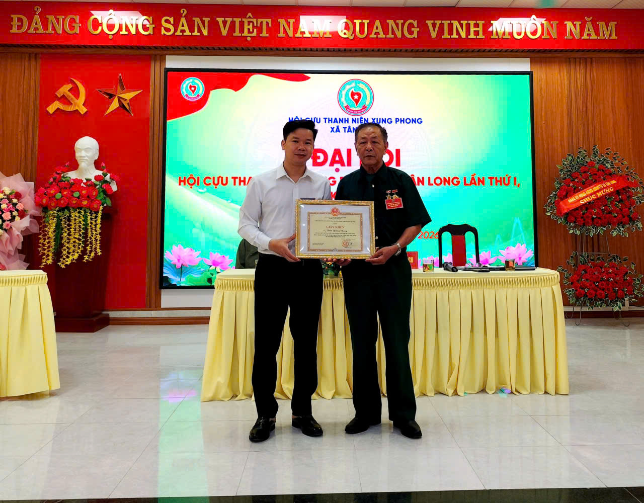 Đại biểu tặng hoa, quà BCH Hội Cựu TNXP xã Tân Long nhiệm kỳ 2026-2031