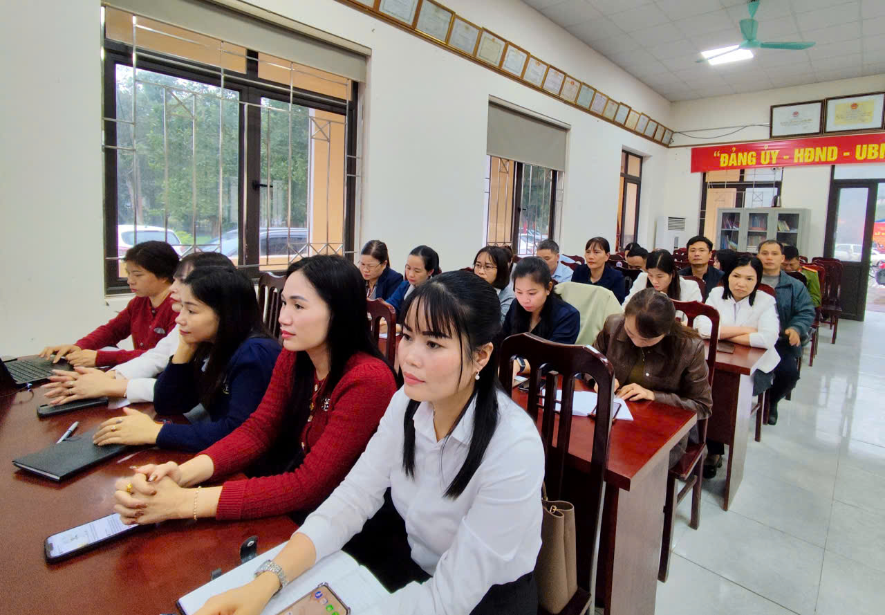 Các đồng chí lãnh đạo và đại biểu dự hội nghị tại điểm cầu nhà văn hóa xã Tân Long .