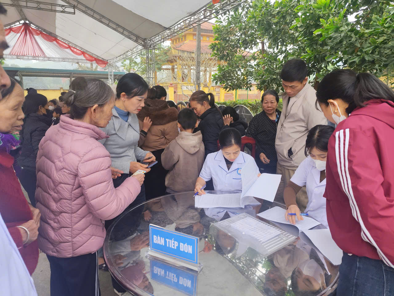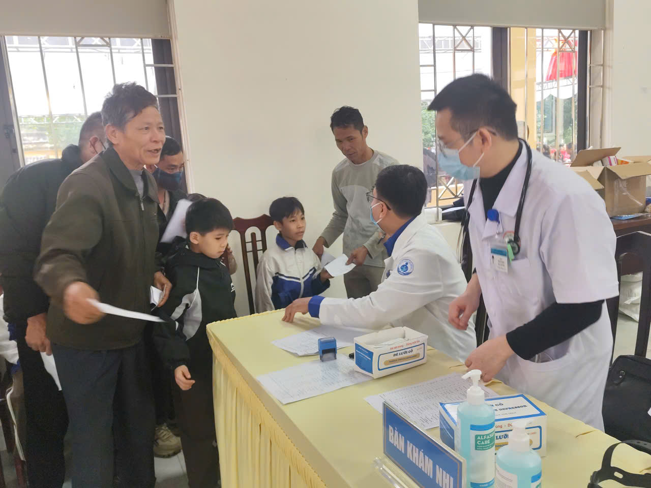 Cán bộ hướng dẫn bà con làm thủ tục lấy phiếu thăm khám bệnh.