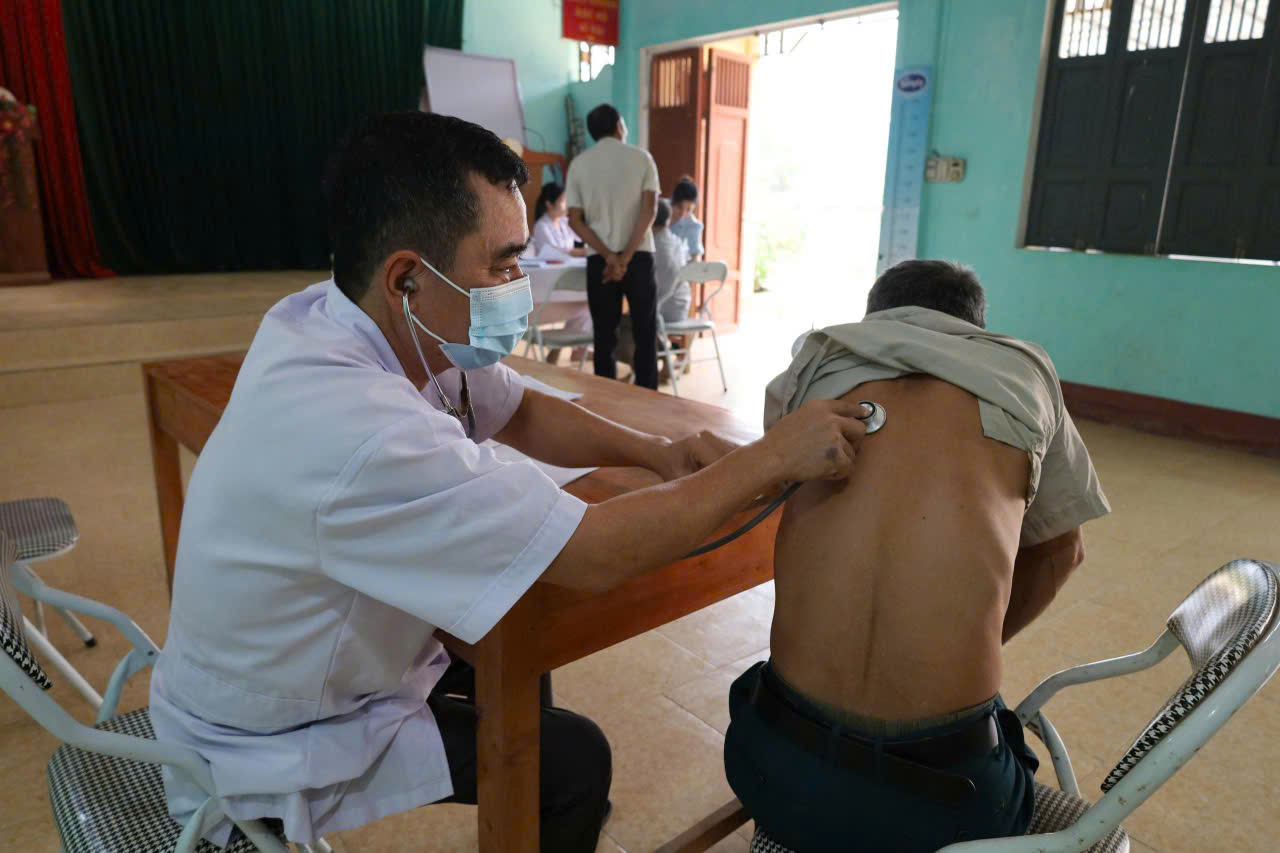 Cán bộ y bác sĩ Trạm y tế xã Tân Long thăm khám bệnh cho người dân tại thôn 18