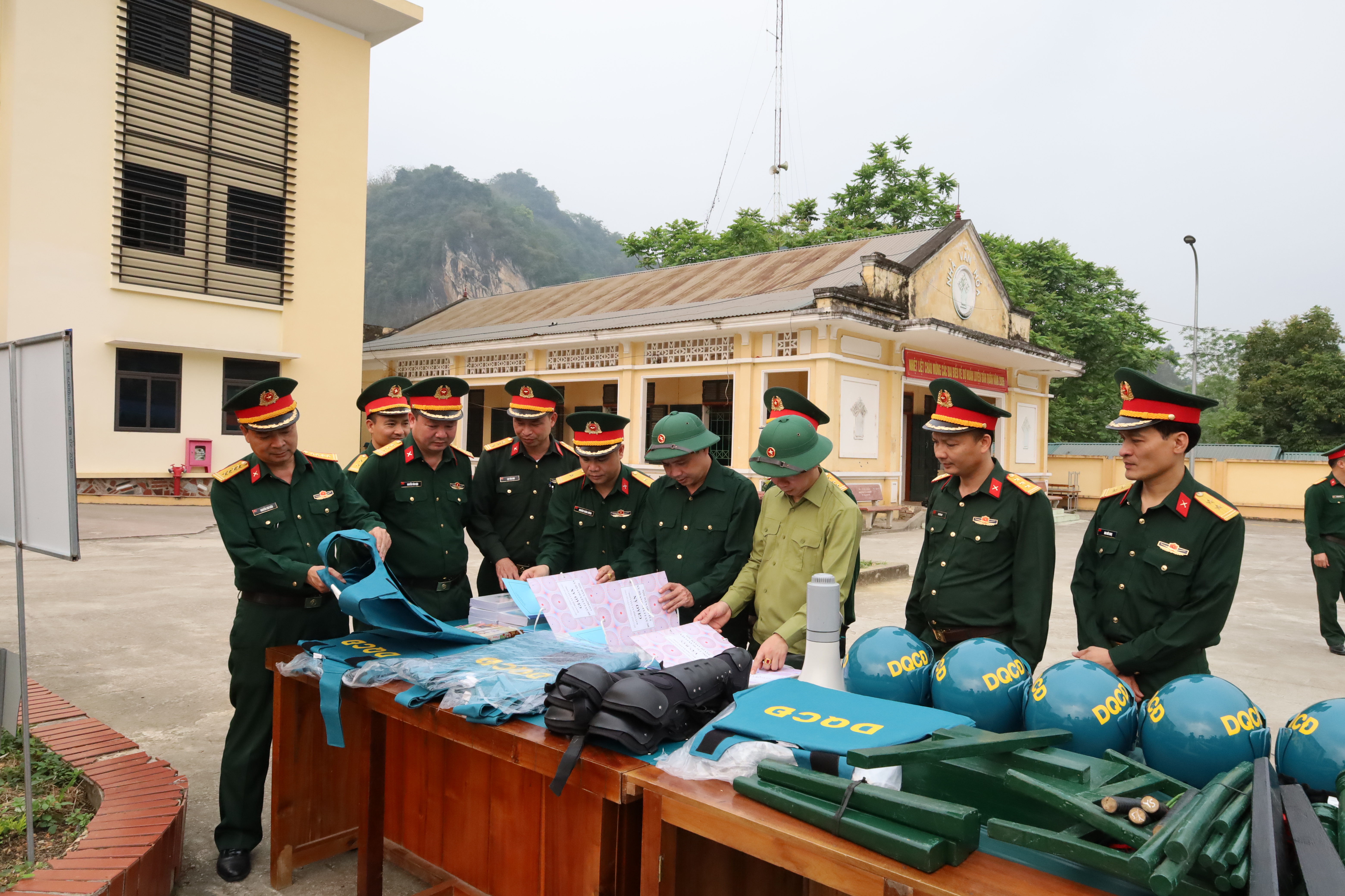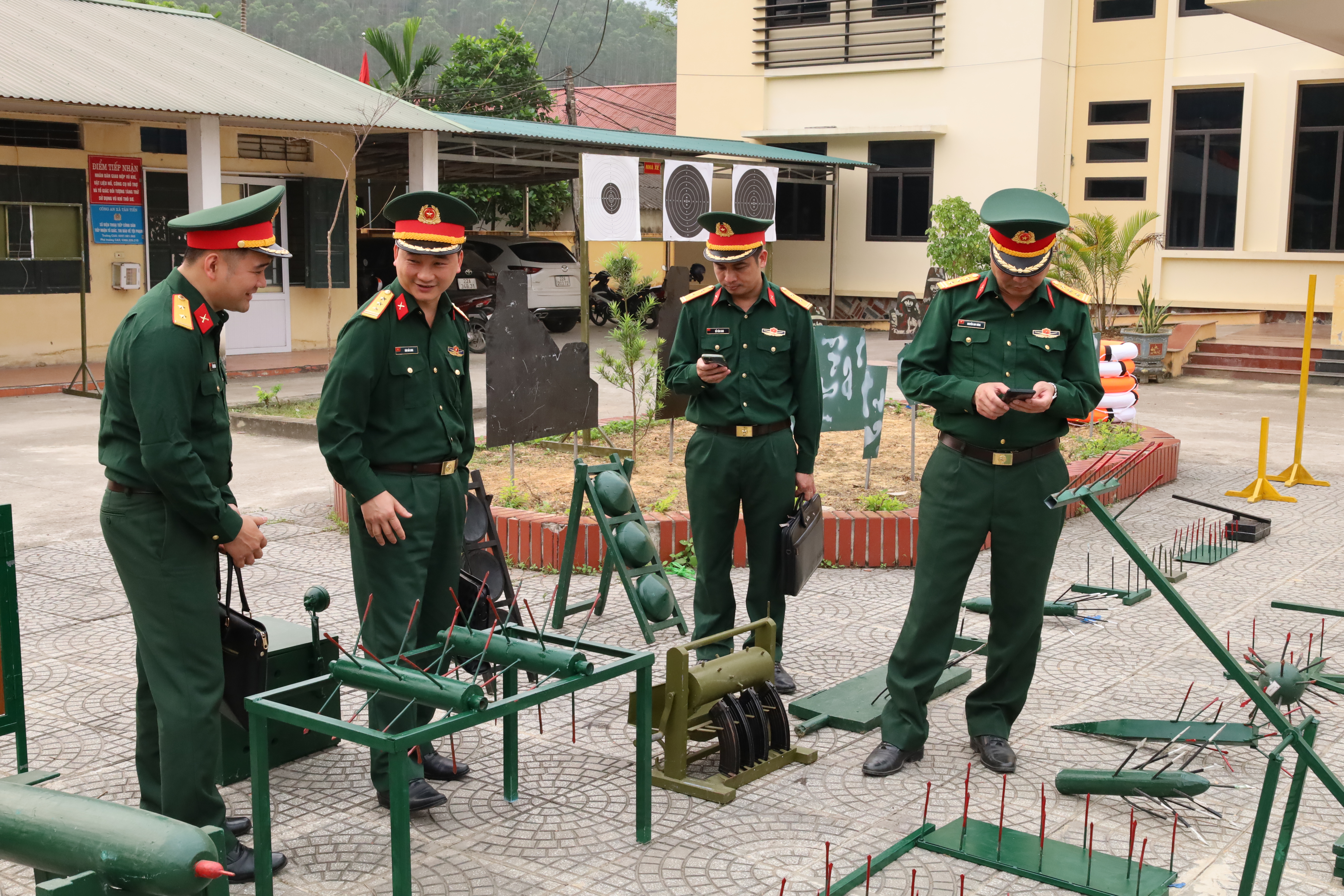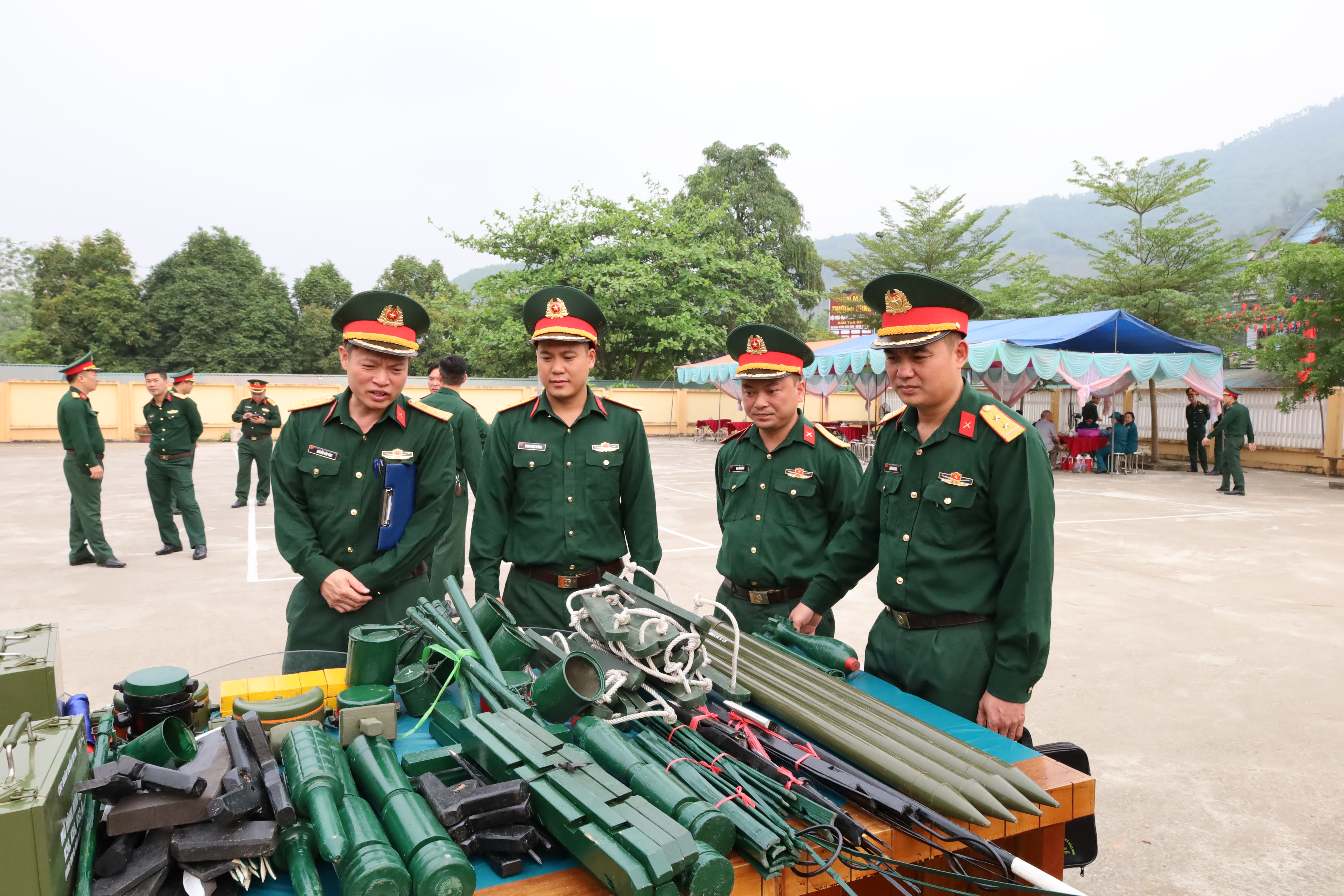 Các đại biểu cùng Ban Chỉ huy quân sự các xã trong khu vực đã tham quan mô hình học cụ, giáo cụ huấn luyện
