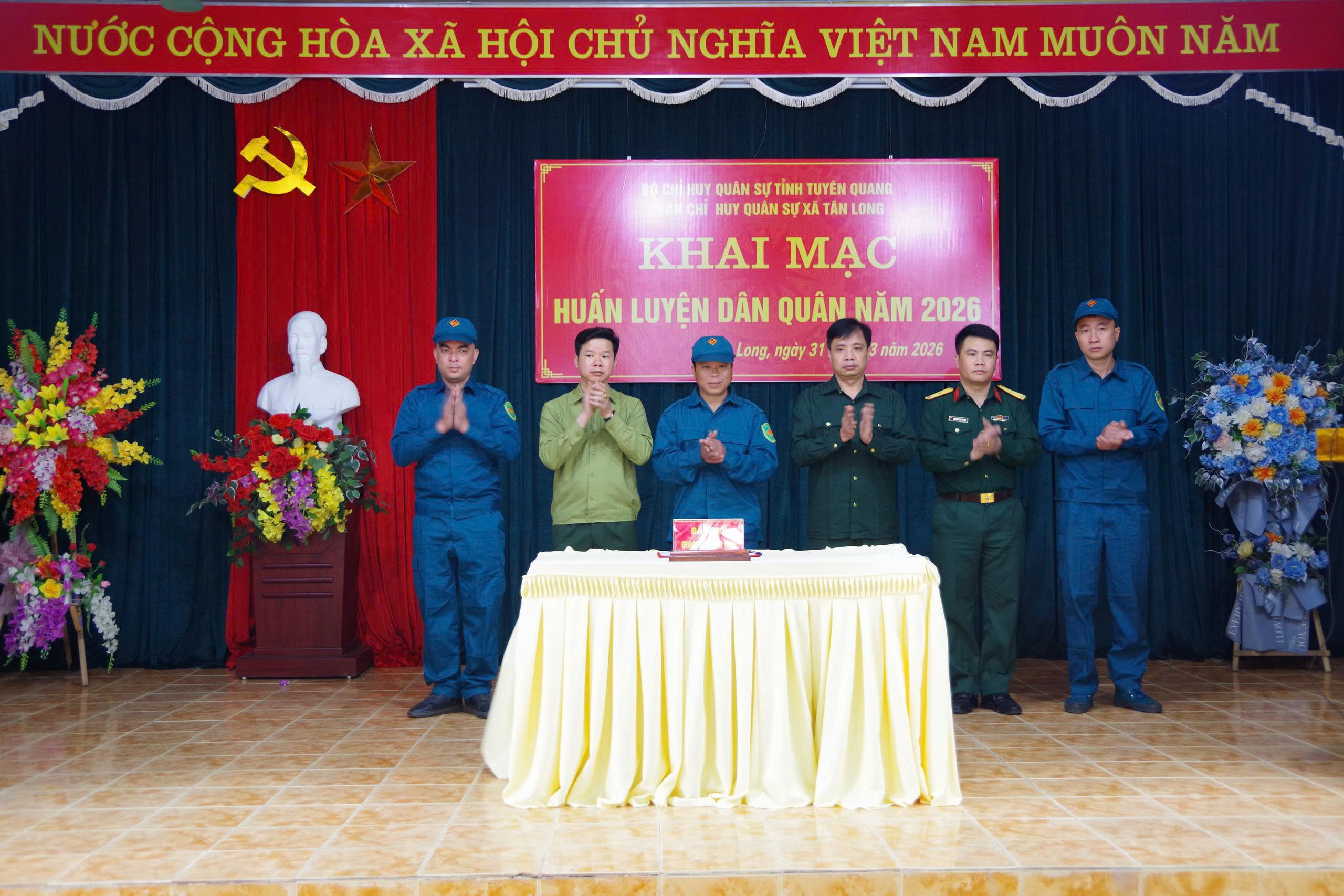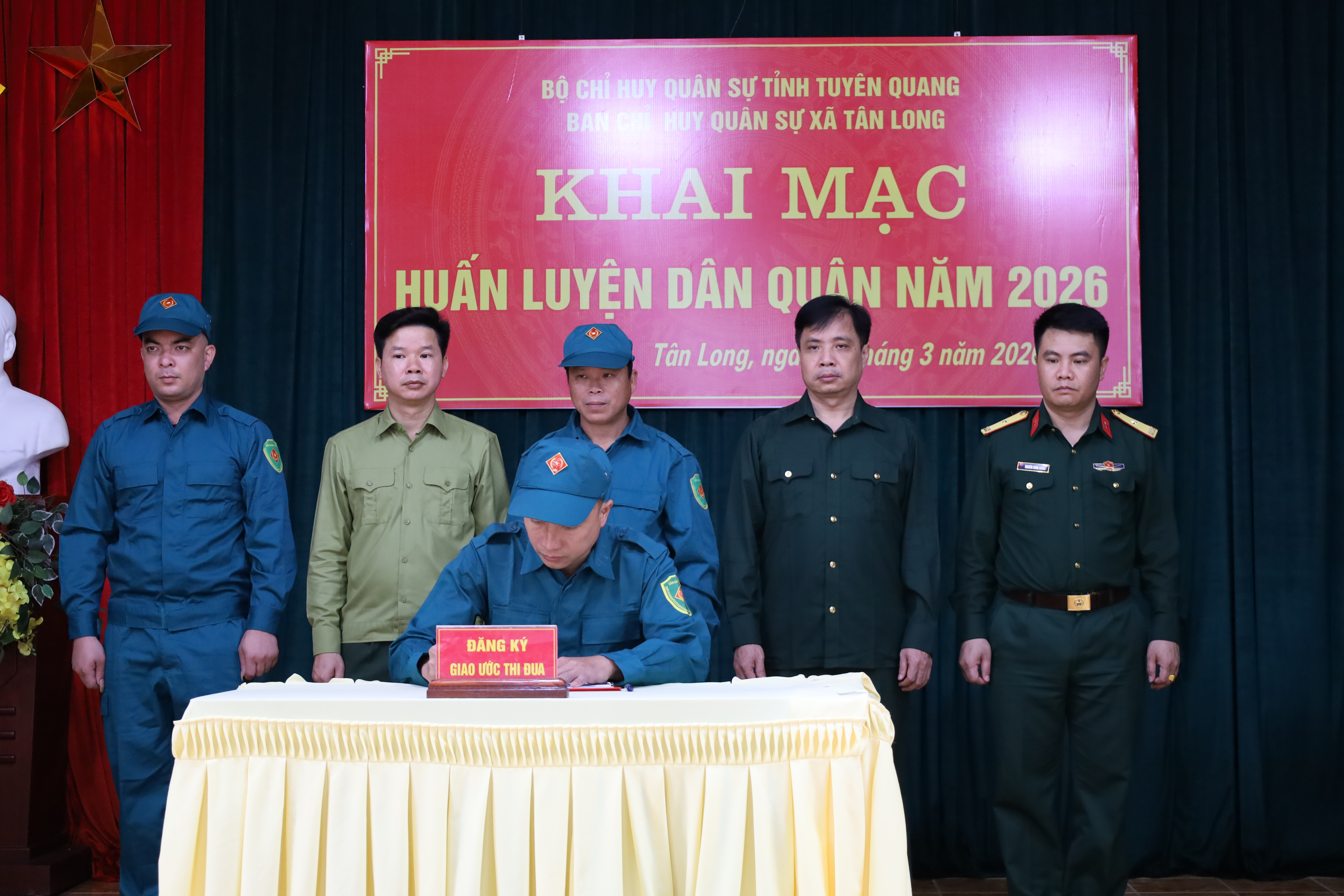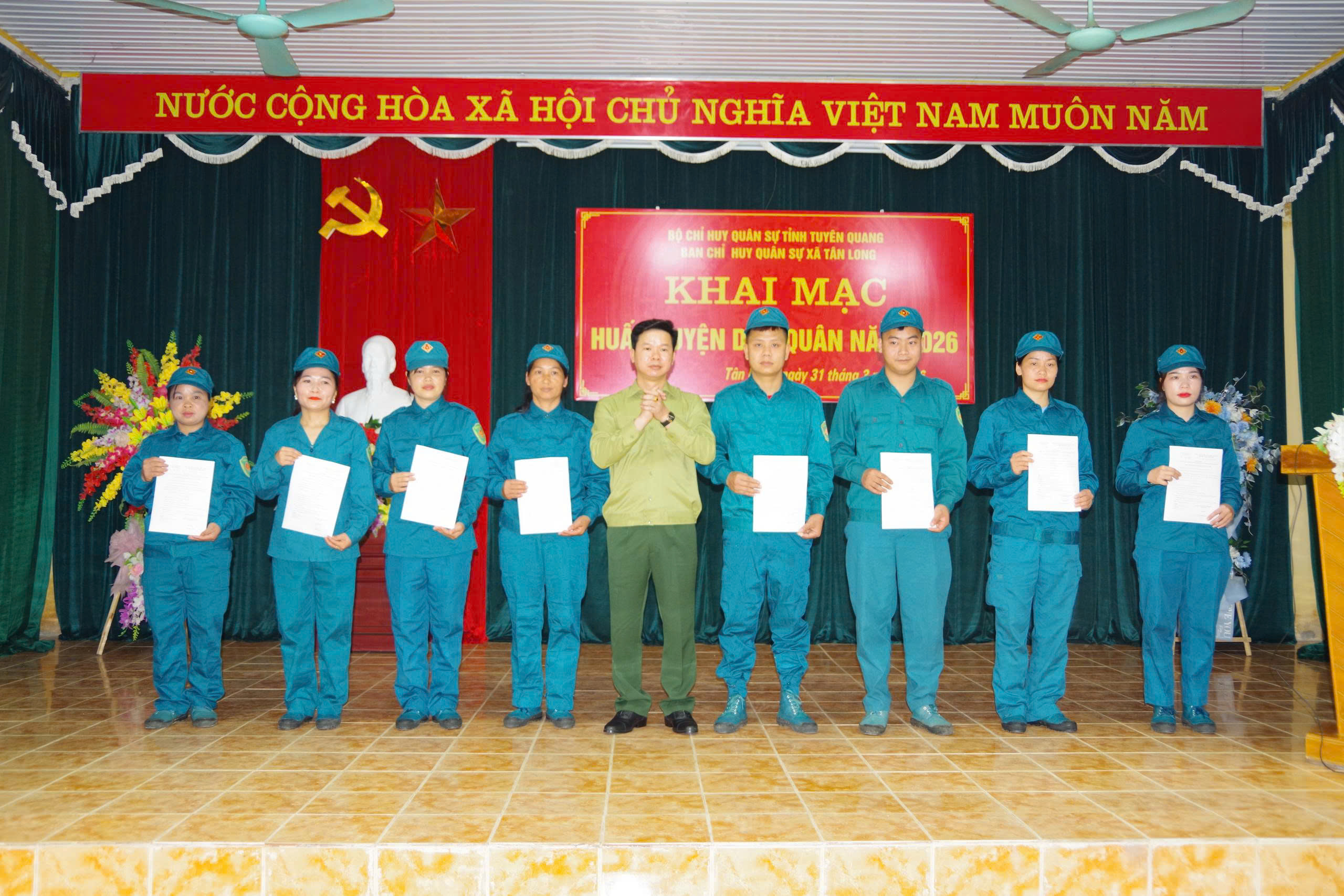 Dự lễ khai mạc có đồng chí Thượng tá Nguyễn Văn Mậu; Phó Tham mưu trưởng Bộ Chỉ huy Quân sự tỉnh, Thượng tá Vũ Quốc Khánh, Phó Chủ nhiệm Chính trị Bộ Chỉ huy Quân sự tỉnh. Về phía lãnh đạo xã có các đồng chí: Nguyễn Mạnh Tiến, Bí thư Đảng ủy, Chủ tịch HĐND, Chính trị viên Ban Chỉ huy Quân sự xã; Trần Đức Luân, Phó Bí thư Đảng ủy, Chủ tịch UBND xã. Cùng dự còn có 23 đồng chí Chỉ huy trưởng Ban Chỉ huy xã phường và 116 cán bộ chiến sỹ dân quân xã Tân Long .